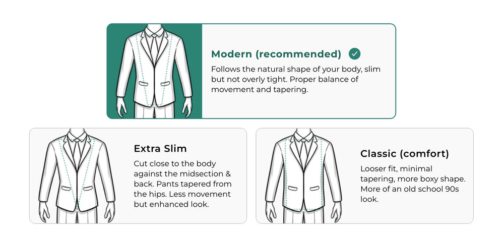 - Choose a base fit (classic, modern, or slim) closest to your body type, then customize. Learn more about how a suit should fit for a perfectly tailored look.