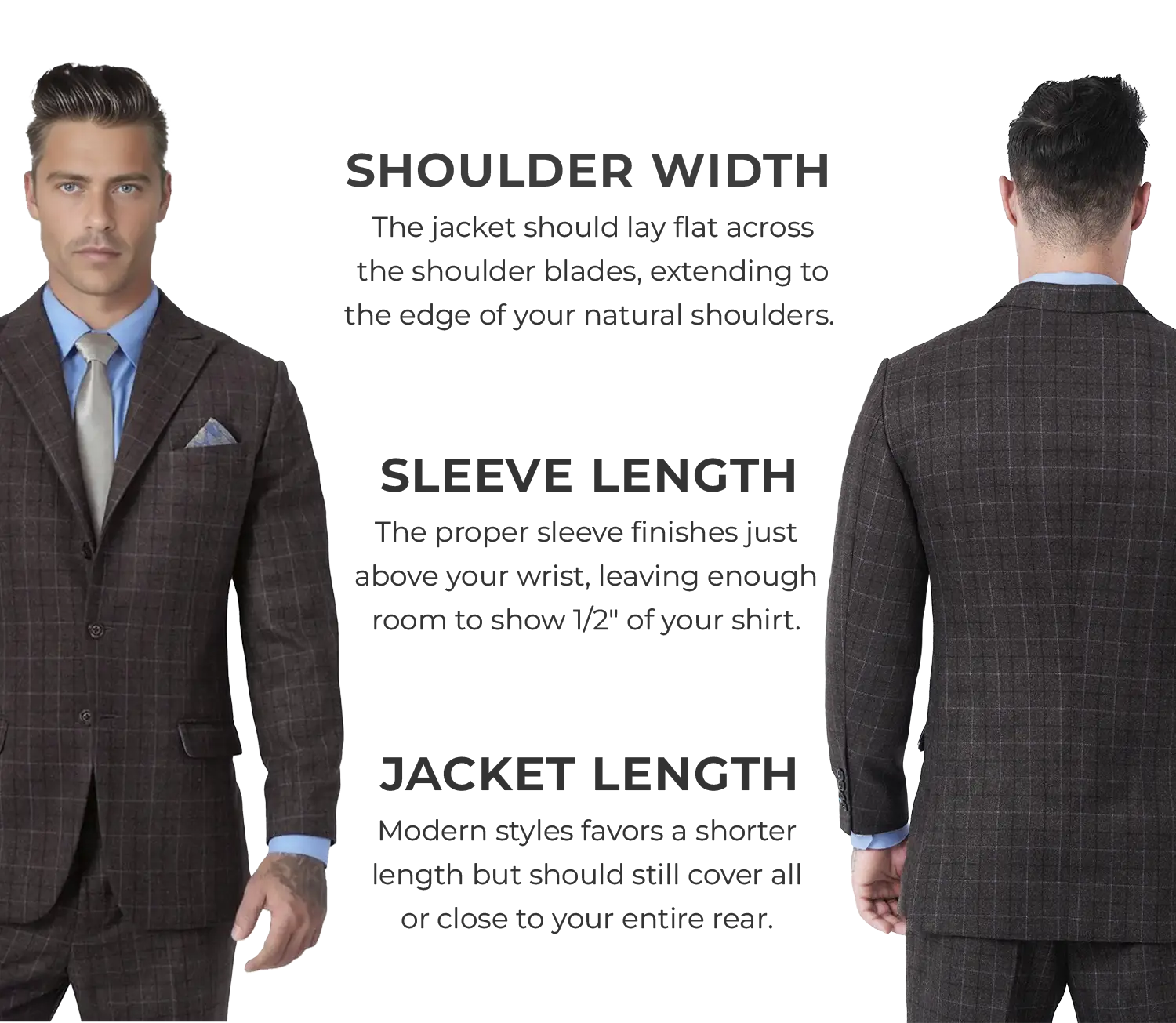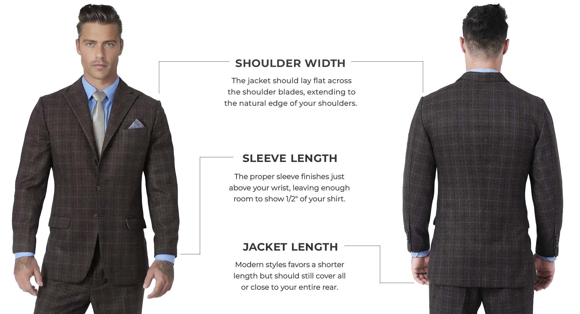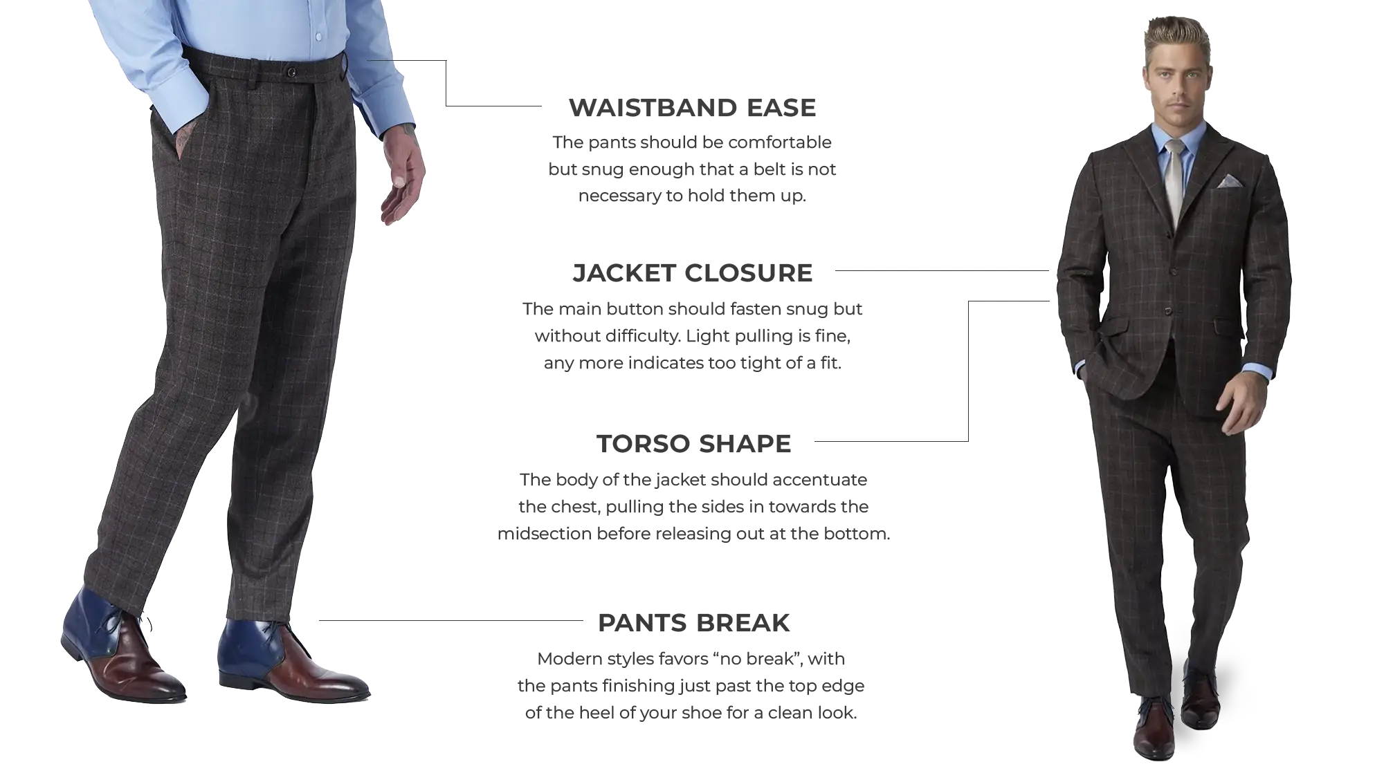 If you're used to off-the-rack clothing, a custom fit can feel a bit different at first. We've created Fit Guides above to walk through - with visuals - how each garment we carry should fit you.