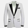 This Alabaster White Twill Tuxedo is the epitome of fashion style and sophistication. Crafted with meticulous attention to detail, this custom-made tuxedo will be a stunner. Enjoy the ultra formal look with this exquisite white tuxedo, fully customizable for you. Black satin peak lapels and accents distinguish this one button look - well paired with a black or white vest underneath.