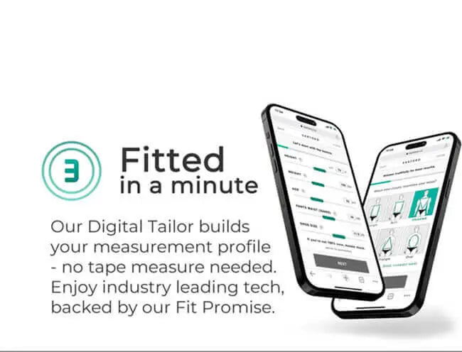 Our Digital Tailor makes getting fitted as easy as 60 seconds answering a few question - tape measure optional.