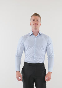 Breeze blue petal shirt featuring a delicate geometric pattern in soft sky blue. The repeating trefoil design creates an elegant, structured look perfect for professional and casual wear. Lightweight fabric offers excellent stretch and comfort with moisture-wicking properties for all-day wear.