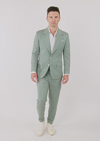Step into modern sophistication with this jade green suit, crafted from Luiciano Tango Super 120s performance wool-70% Merino wool, 28% poly, and 2% Lycra for comfort and resilience. The single-breasted jacket features wide peak lapels, flap pockets, and a two-button closure, offering a tailored yet flexible fit. Paired with matching trousers, this ensemble is ideal for spring weddings, rooftop soirées, or any occasion where refined style meets contemporary ease.