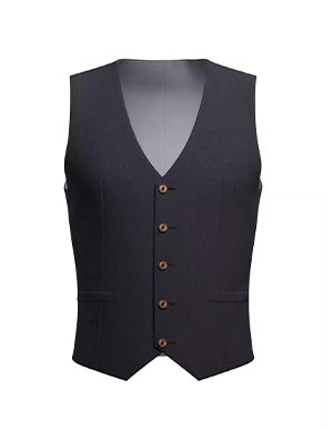 Performance stretch vest in luxurious jet black Merino wool blend. Five-button design with refined fit offers versatile layering options. Exceptional comfort and breathability for business casual or formal three-piece styling with superior stretch technology.