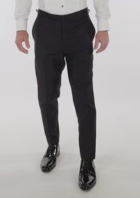 These black tuxedo pants deliver comfort and style when you need to look your best. Crafted from premium Super 130s Merino wool, they drape beautifully and feel great to wear. Built for year-round use, these pants are expertly tailored for a clean, modern fit that works with any formal jacket and vest combination.