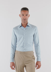 Sage blue shirt with thin white pinstripes in a bamboo blend fabric. Features comfortable stretch, moisture-wicking properties, and a smooth finish. Classic collar and button-front design with long sleeves.