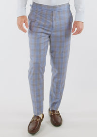 Crafted from luxurious Super 130s pure merino wool with a refined 280 GSM weight, these Vista Blue Checked Pants by Cavani offer exceptional comfort and durability. The elegant checked pattern and precise tailoring, complemented by side adjusters, ensure a perfect fit and timeless style. Elevate your wardrobe with these sophisticated pants designed for those who appreciate quality and distinction.