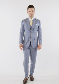 Crafted from luxurious Super 130s pure Merino wool with a 280 GSM weight, the Vista Blue Checked Thompson Suit offers refined elegance and exceptional comfort. Woven by Cavani, its fabric ensures durability and a smooth finish. Featuring a wide notch lapel, this suit combines classic tailoring with a modern edge, perfect for making a confident statement at any occasion.